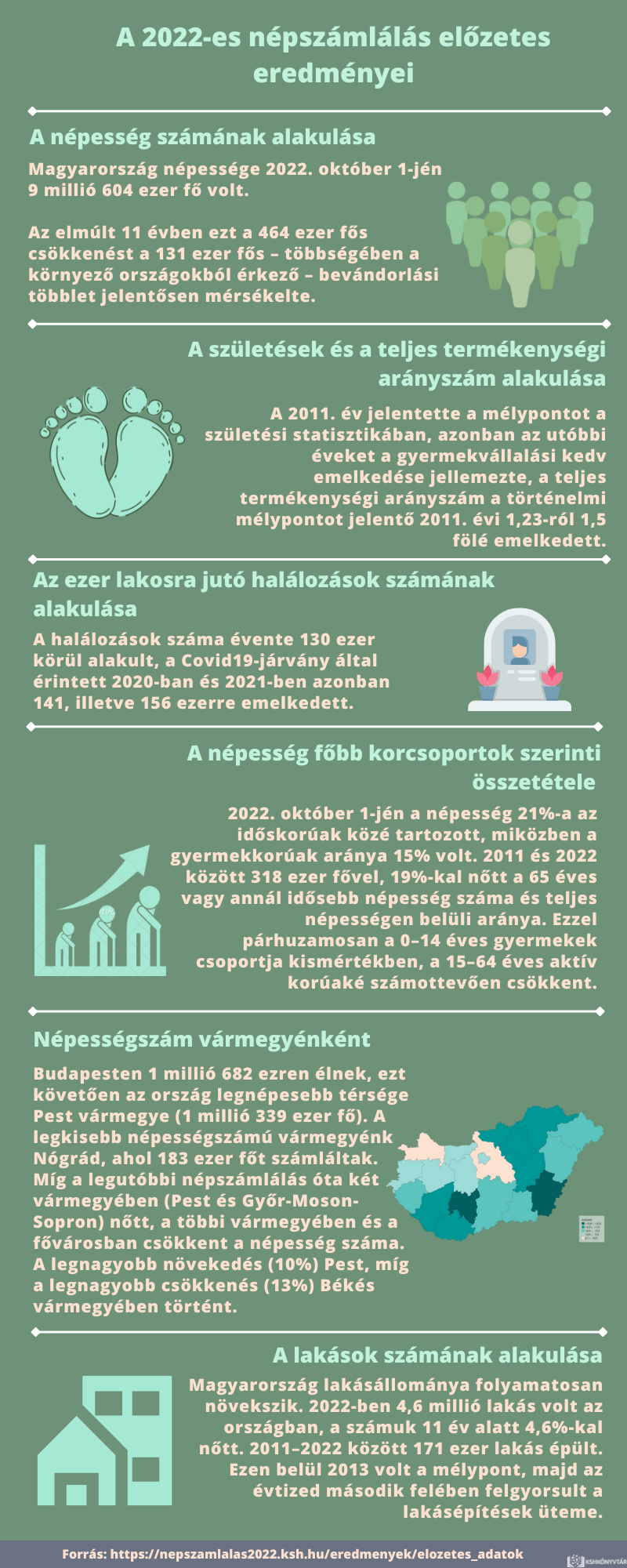 A Központi Statisztikai Hivatal 2022. október 1. és november 28. között hajtotta végre Magyarország 16. népszámlálását. Az infografikán bemutatott adatok a népszámlálás eszmei időpontjában, 2022. október 1-jén fennálló állapotot tükrözik.