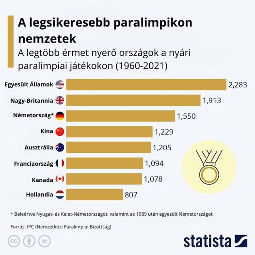 Az alábbi infografika a Nemzetközi Paralimpiai Bizottság adatait mutatja, amely szerint a nyári olimpiai játékokhoz hasonlóan az Egyesült Államok a domináns nemzet a paralimpiákon a megszerzett érmek számát tekintve. Ez idáig összesen 2283 éremmel az USA rendelkezik a legtöbb paralimpiai dobogós győzelemmel. Nagy-Britannia csapata jelenleg a második helyen áll 1913 éremmel. Németország 1550 éremmel a harmadik az összesített nyári paralimpiai éremtáblázaton.