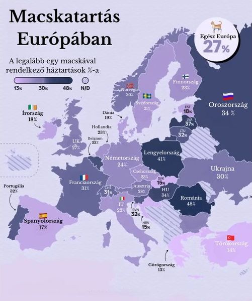 A legtöbb macskás háztartást Romániában regisztrálták, ahol a macskák a háztartások 48%-ában vannak jelen. Lengyelország a második helyen áll, ahol a háztartások 41% -a legalább egy macskával rendelkezik.