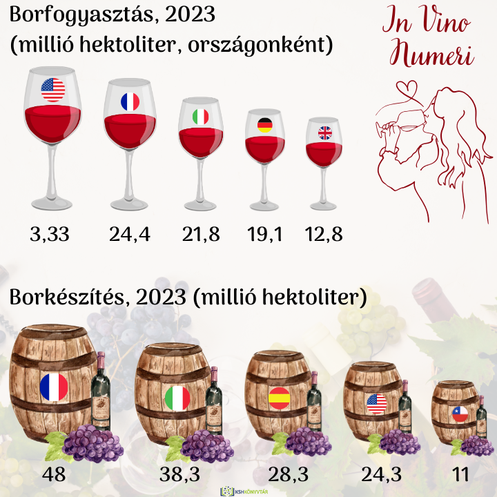 Az infografikán a legjelentősebb borkészítő és borivó nemzetek láthatóak. Hazánkban 2023-ban körülbelül 2,4 millió hektoliter bor készült.