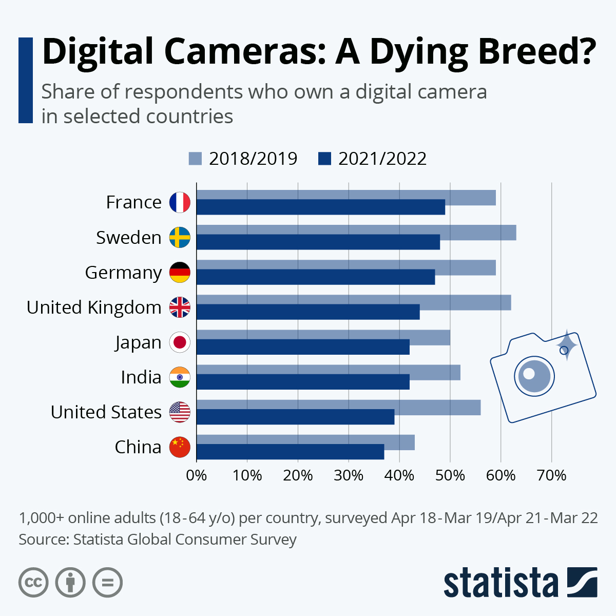 Amint az alábbi Statista felmérésen alapuló táblázat mutatja, a digitális fényképezőgépek birtoklásának száma világszerte csökkent az elmúlt néhány évben, és valószínűleg a használatuk mértéke még ennél is nagyobb mértékben zuhant.