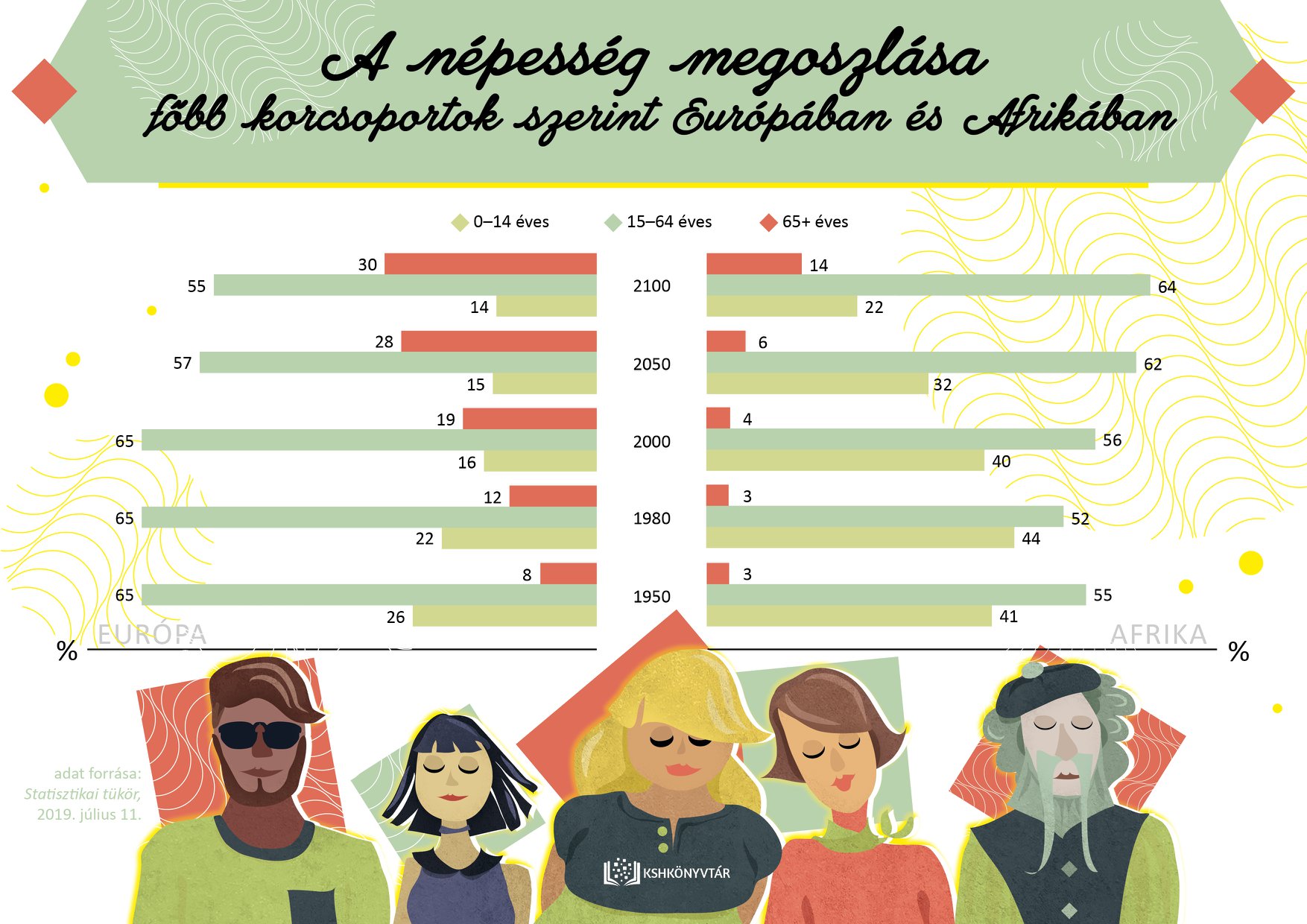 Infografikánkon a népesség megoszlását mutatjuk a főbb korcsoportokban Európában és Afrikában. A két kontinens adatai jól érzékeltetik a két végletet, az idősödő Európát és a fiatal Afrikát. A vizsgált – 1950-től 2100-ig terjedő – időszakban Afrika nagymértékben gyarapodó tendenciát mutat, a stagnáló és fogyó népességszámmal jellemezhető Európával szemben.