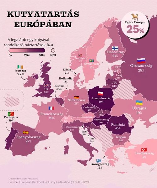 Magyarországon regisztrálták a legtöbb kutyás háztartást, ahol a háztartások 50%-ában van kutya. A második helyen Lengyelország áll, ahol a háztartások 49% -a legalább egy kutyával rendelkezik.
