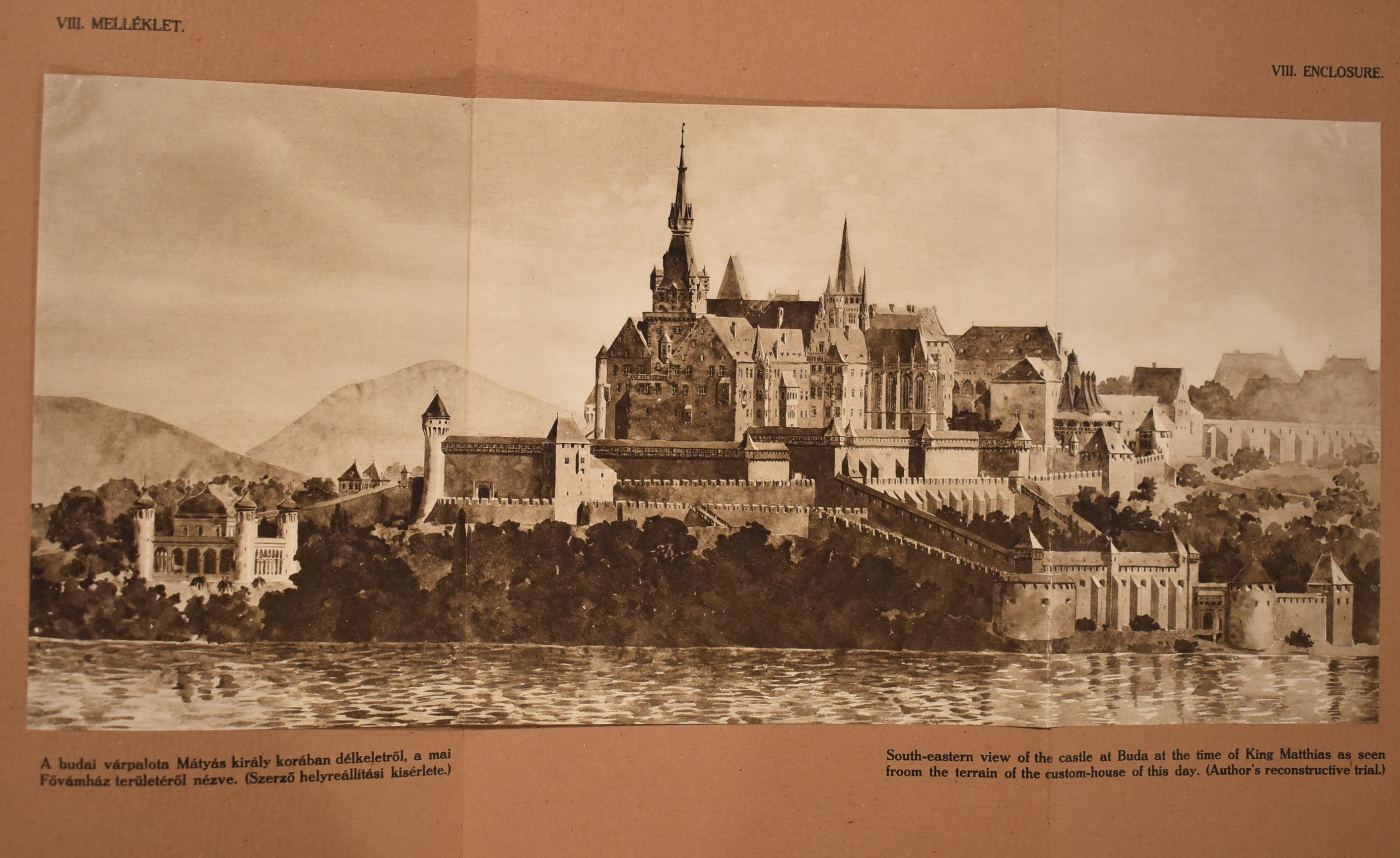 VIII. melléklet. A budai várpalota Mátyás király korában délkeletről, a mai Fővámház területéről nézve. (Lux. 1922)