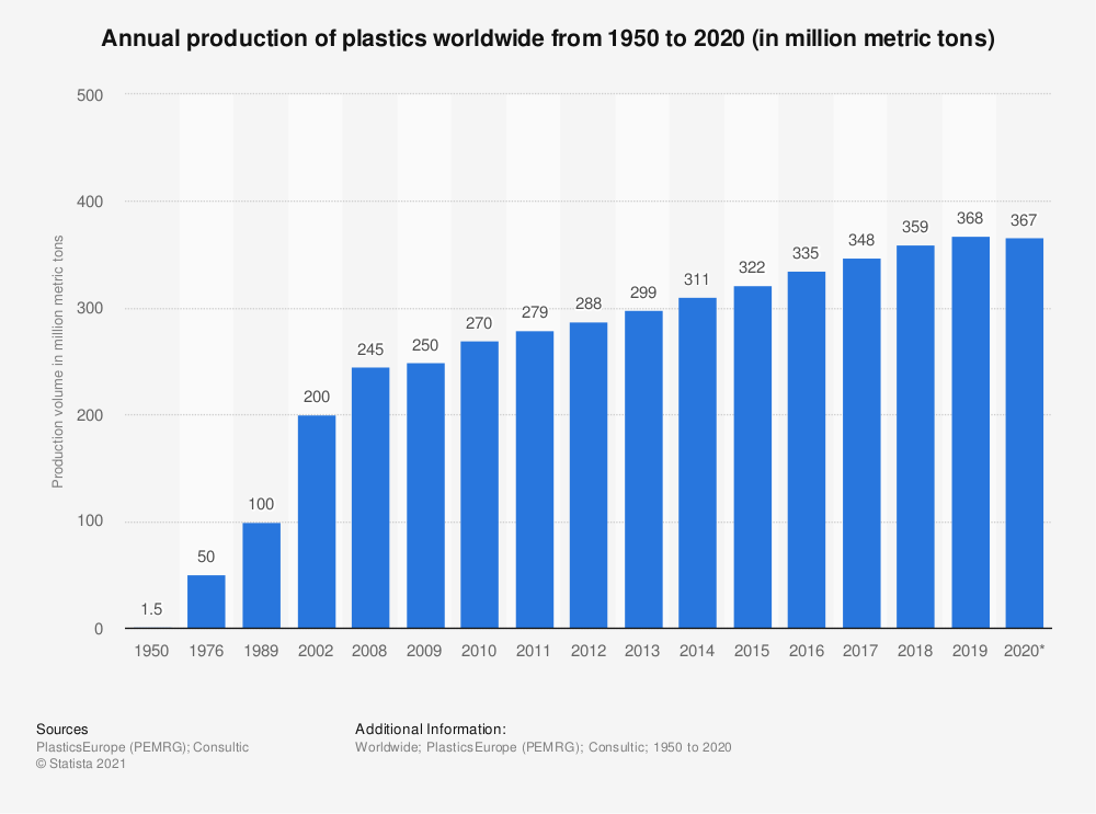 A PlasticsEurope adatai szerint 1950 óta szinte töretlen ütemben növekedett a világ műanyagtermelése: Az induló évben mindösszesen másfél millió tonnából 1977-re 50 millió tonna, 1989-re 100 millió tonna előállított műanyag 2002-re megduplázódott, 200 millió tonnára. 2015-ben 322 millió tonna műanyagot bocsátott ki magából a világ ipara, majd 2018-ban elérte a döbbenetes mennyiségű 359 millió tonnát.