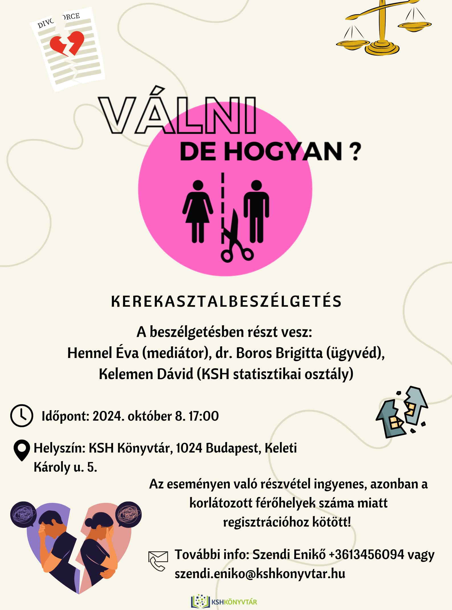 Kerekasztal-beszélgetést tart a Könyvtárban Hennel Éva és dr. Boros Brigitta Válni de hogyan? címmel. A beszélgetésben részt vesz Kelemen Dávid, a KSH statisztikai osztály munkatársa is.