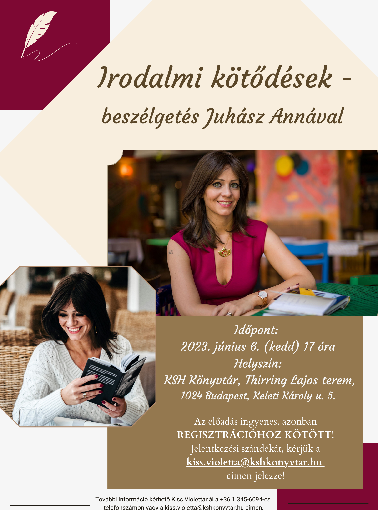 Sok szeretettel várunk minden érdeklődőt Irodalmi kötődések című beszélgetőestünkre, melynek vendége Juhász Anna lesz, aki ma hazánk egyik legsikeresebb irodalmi szervezője.
