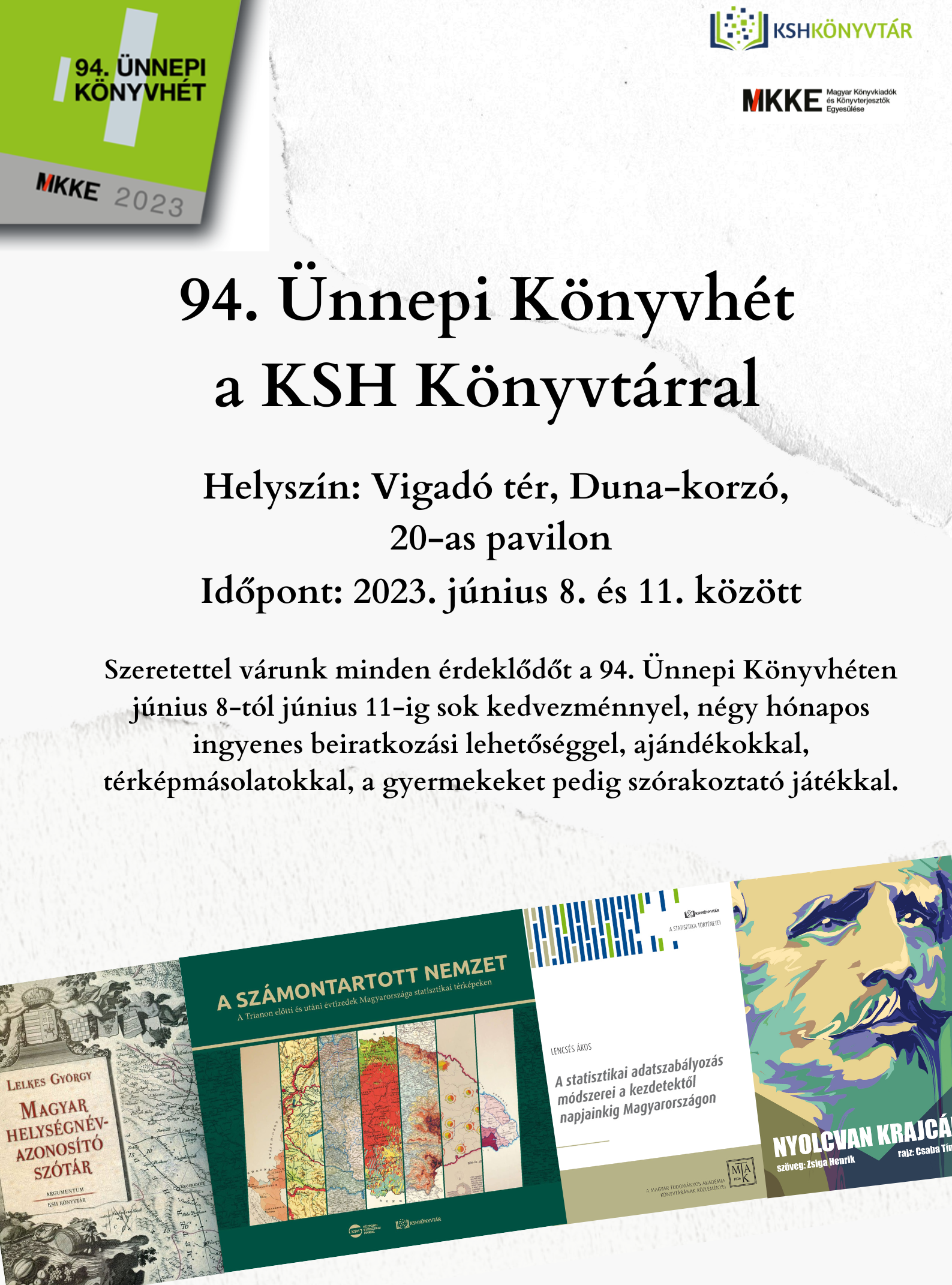Szeretettel várunk minden érdeklődőt a 94. Ünnepi Könyvhéten június 8-tól június 11-ig sok kedvezménnyel, négy hónapos ingyenes beiratkozási lehetőséggel, ajándékokkal, térképmásolatokkal, a gyermekeket pedig szórakoztató játékkal.